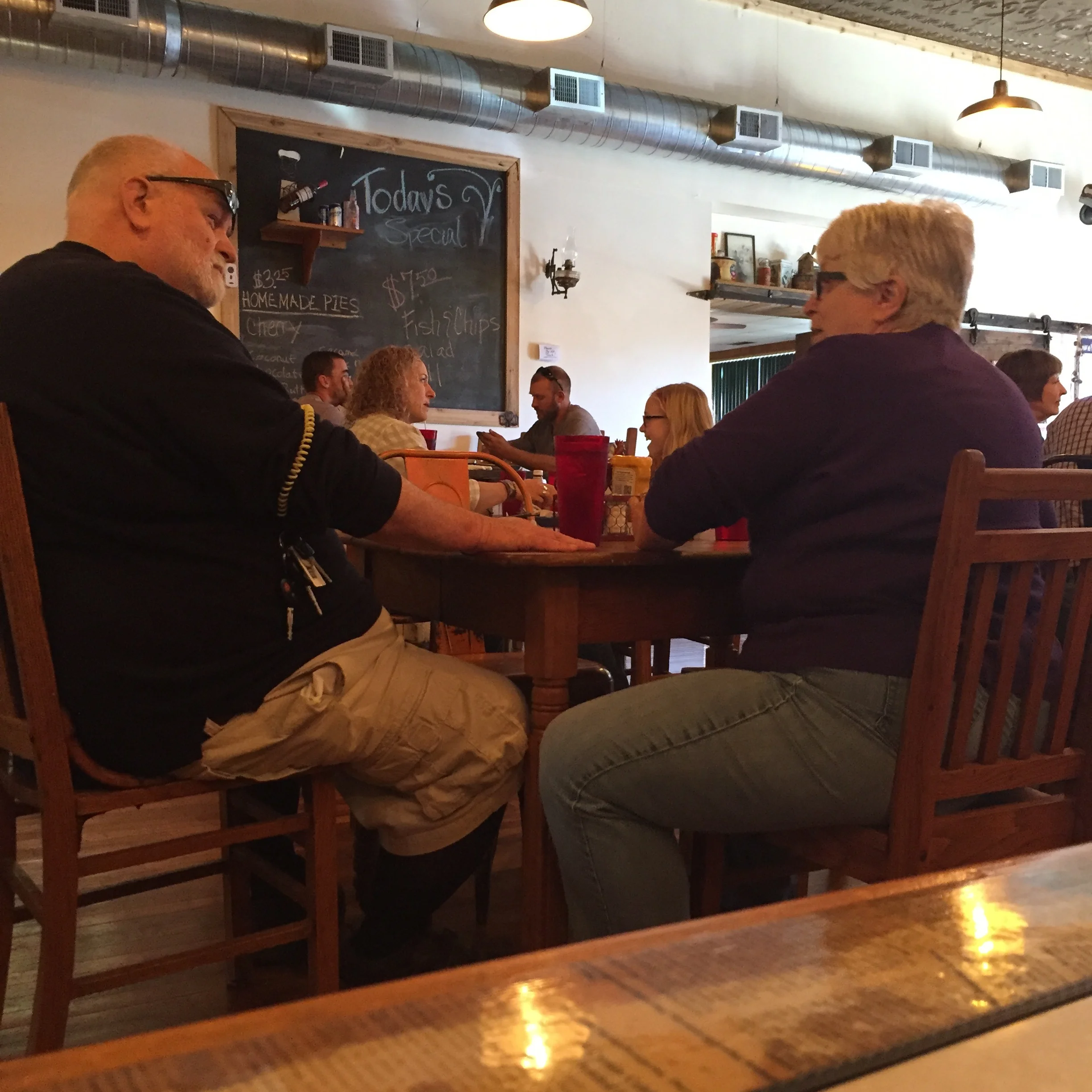 Old Couple on the Road. He's seeing the family flinthill homestead. All cut sandstone and barn wood waiting to be harvested. The family plot, one last time before his turn comes. Worried, the older folk won't make it up the hill.